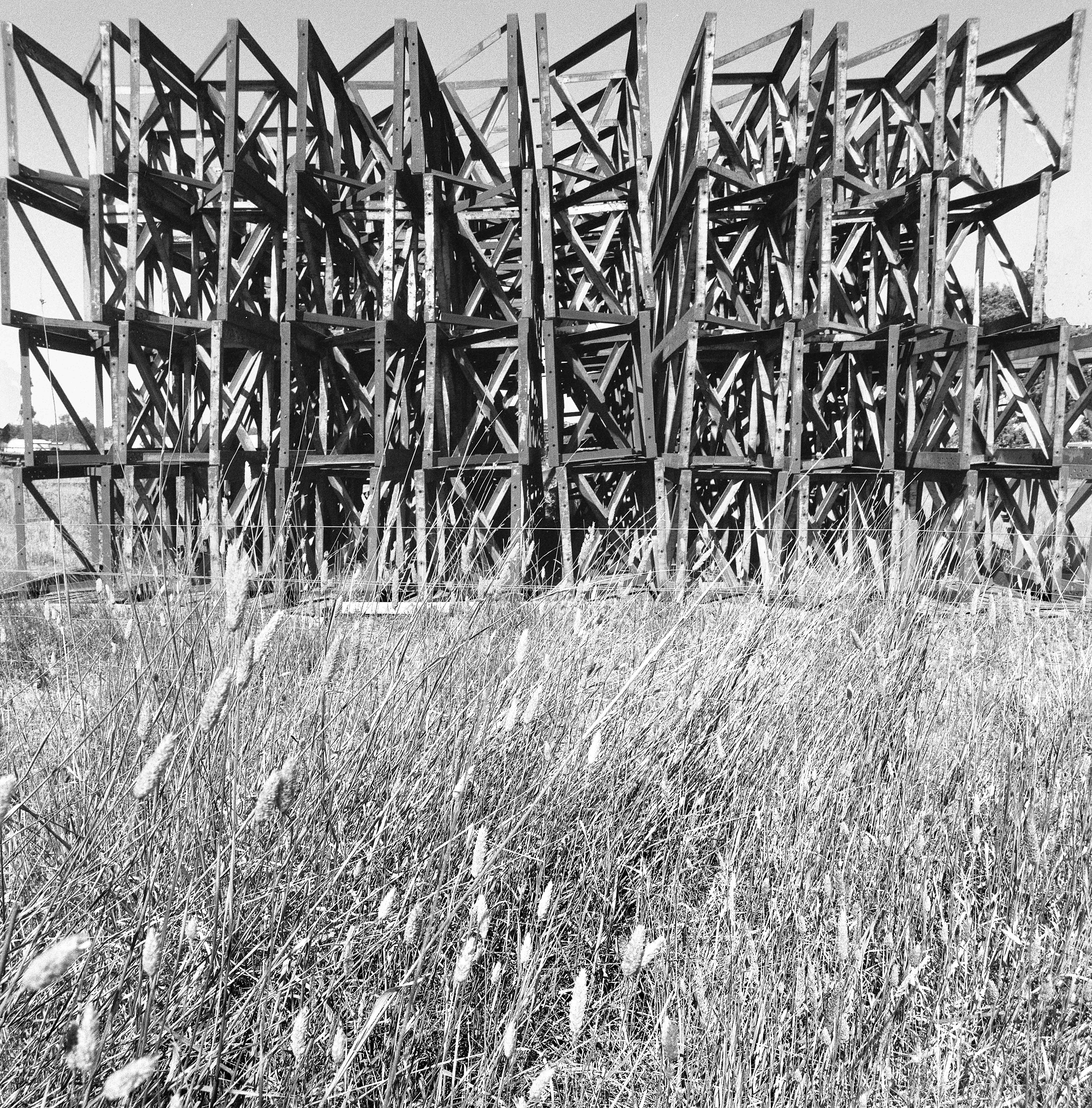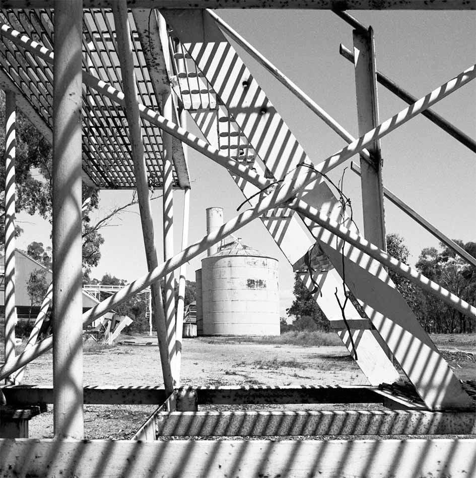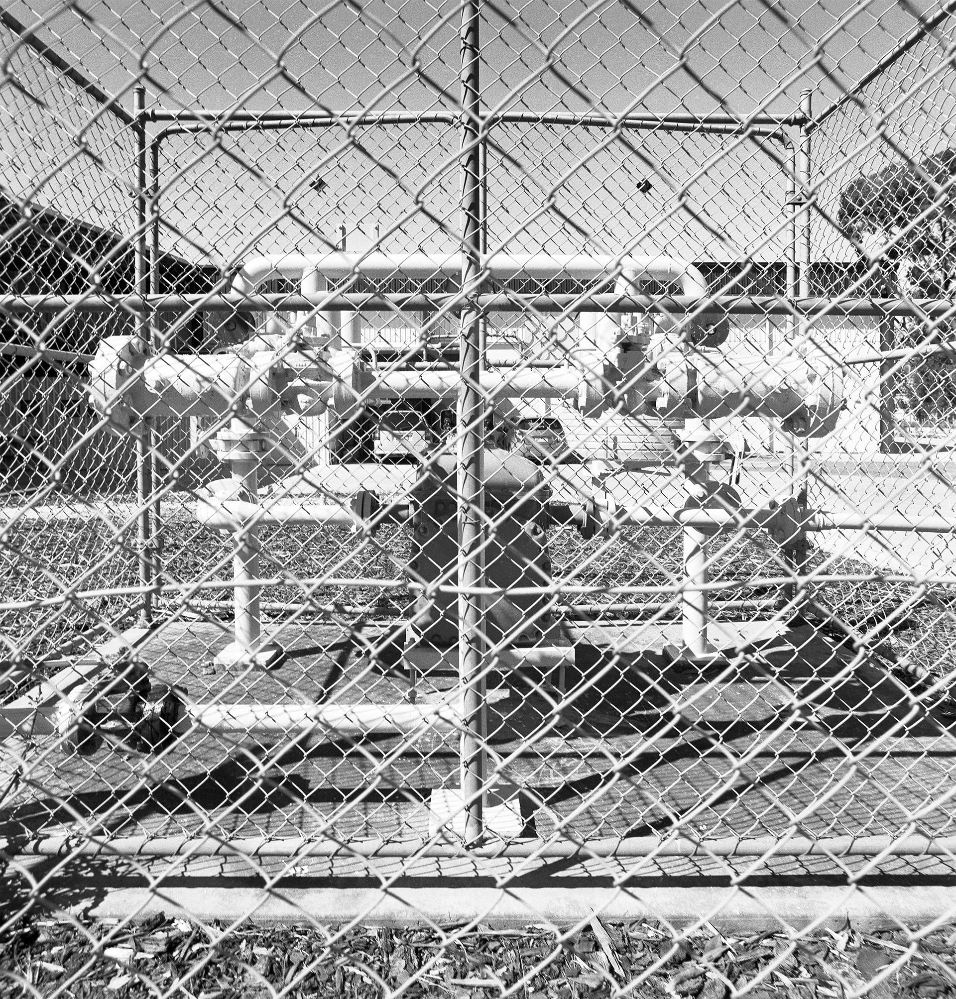 A formal exercise: photograph industrial subject-matter and compose images that are overloaded with details, lines and layers. Photographed with medium format film camera using a superwide lens.
