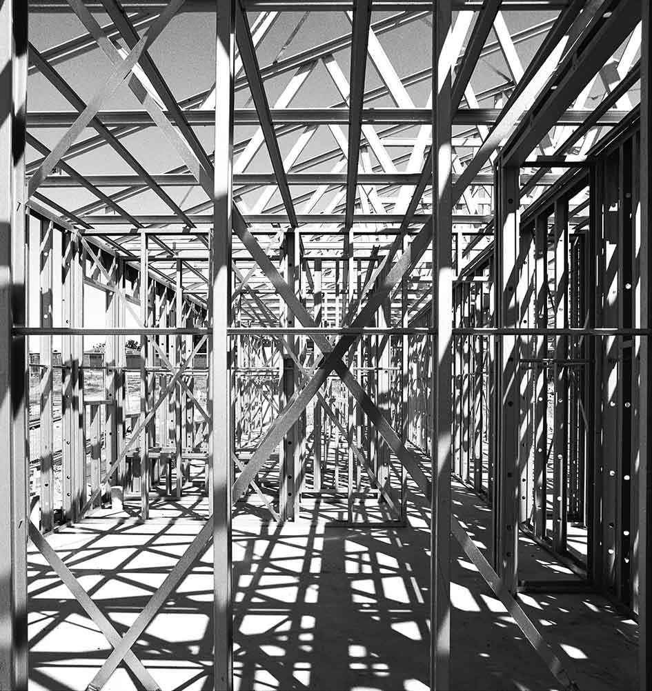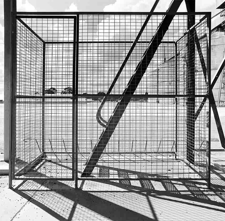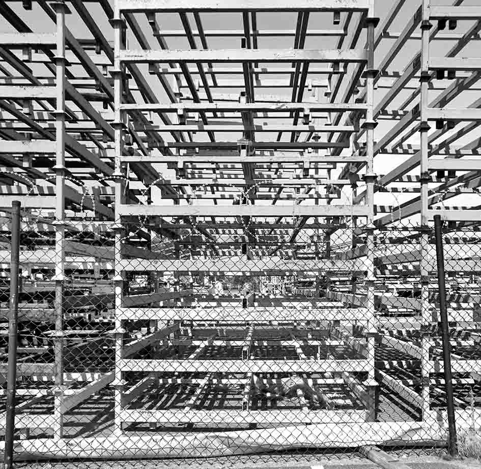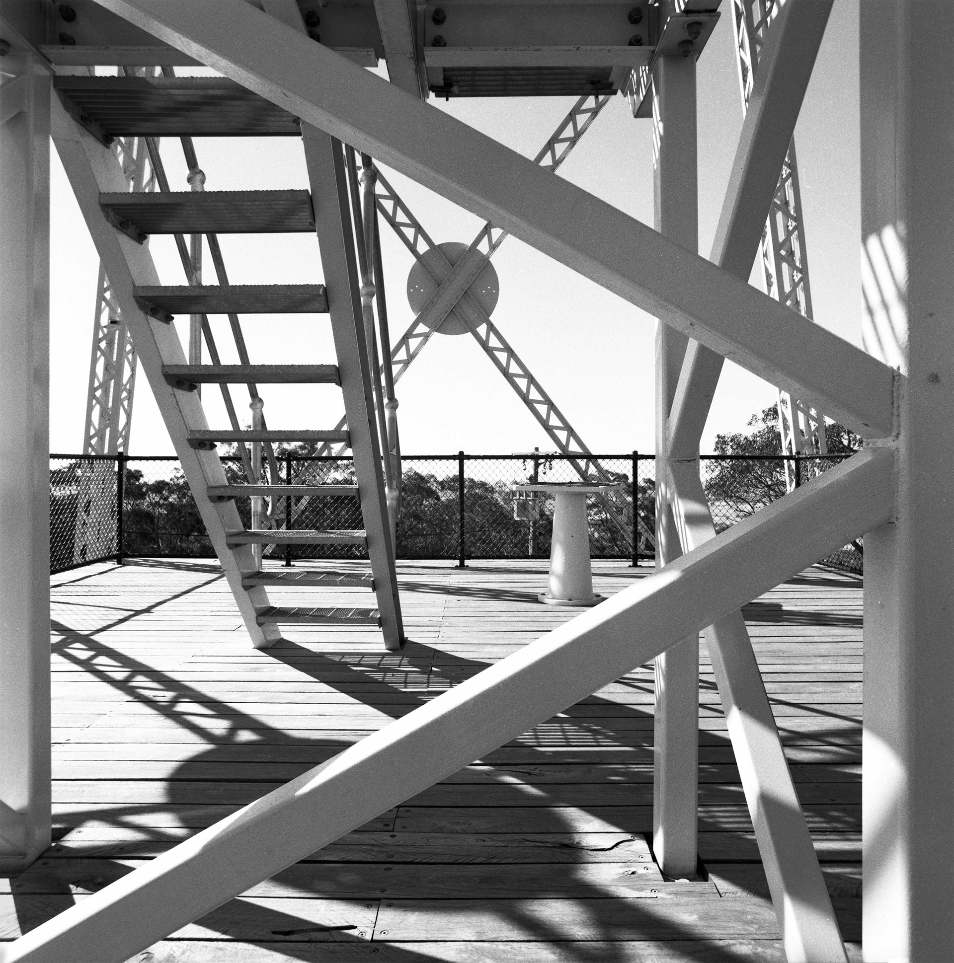 A formal exercise: photograph industrial subject-matter and compose images that are overloaded with details, lines and layers. Photographed with medium format film camera using a superwide lens.